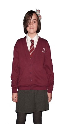 Maroon blazer with dark grey skirt/pinafore/trousers, white blouse with school tie and grey pullover /cardigan