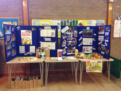 We brought in a community artist for a session to help bring our leaflet design to life. Once ready we went to a parents group and a childcare class in our community and demonstrated savings that could be made. We created a table display showing how much fruit & veg; we could buy and prepare for £5 compared to only a few shop-bought jars. We gave each person a “goody bag”, containing utensils so that they could put the ideas into practice at home. We invited the local credit union along so that people could join and start saving.